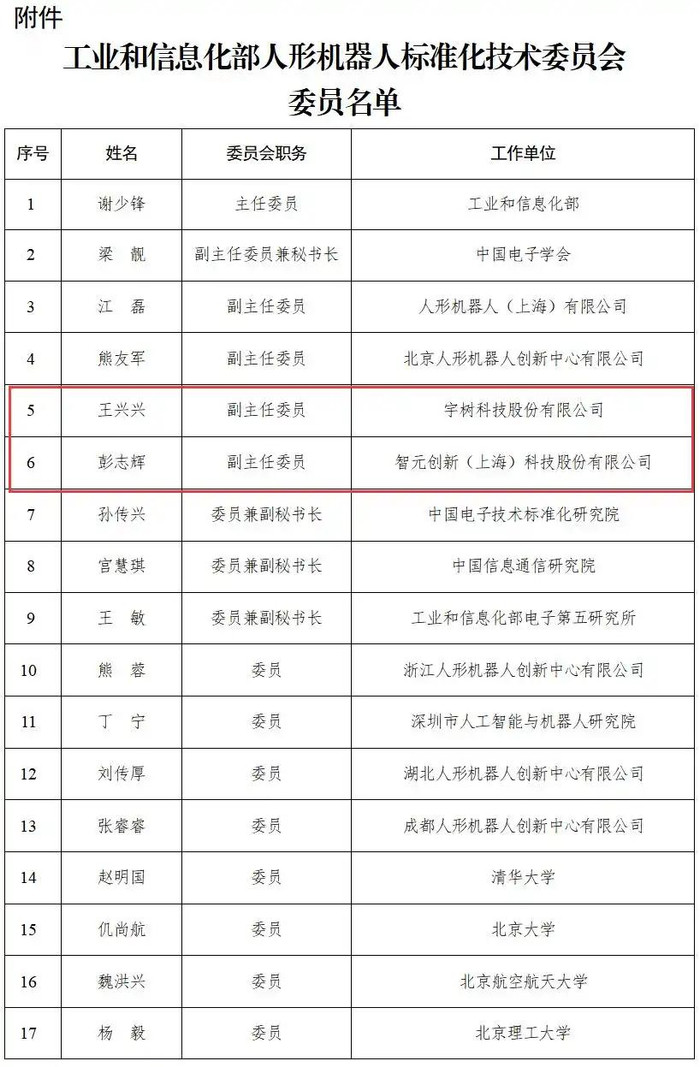 11月24日,工信部网站发布《工业和信息化部人形机器人标准化技术委员会委员名单公示》。在公示名单中,王兴兴和彭志辉均在委员会中担任副主任委员。