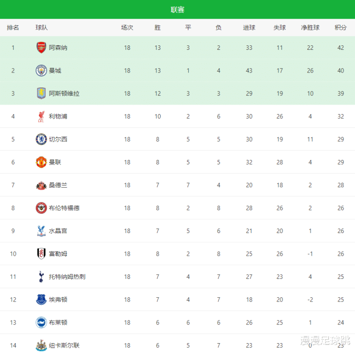 从积分榜整体形势来看,本轮比赛对英超格局的影响并不小。阿森纳以42分继续领跑,但领先优势并不稳固。曼城以40分紧追其后,阿斯顿维拉也拿到39分,前三名分差极小,争冠呈现出明显的三强并立态势。