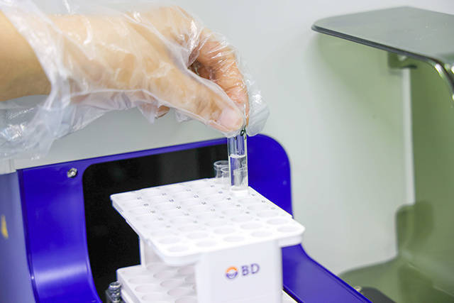 托克托县医院重点实验室工作人员对患者标本进行检验。乌力更摄